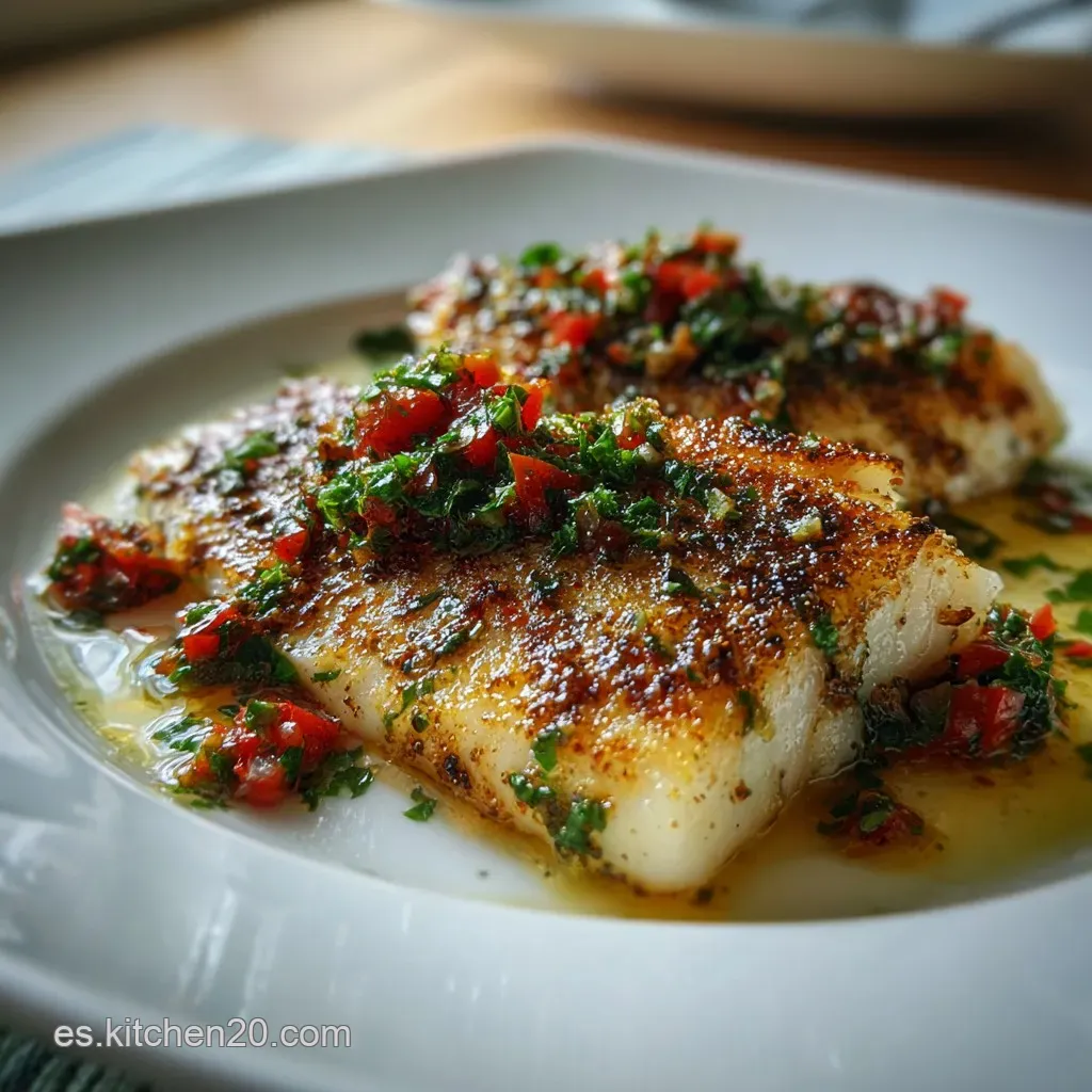 - Finalizar el plato. Saca la fuente del horno, vierte el refrito caliente sobre el pescado y espolvorea el perejil.